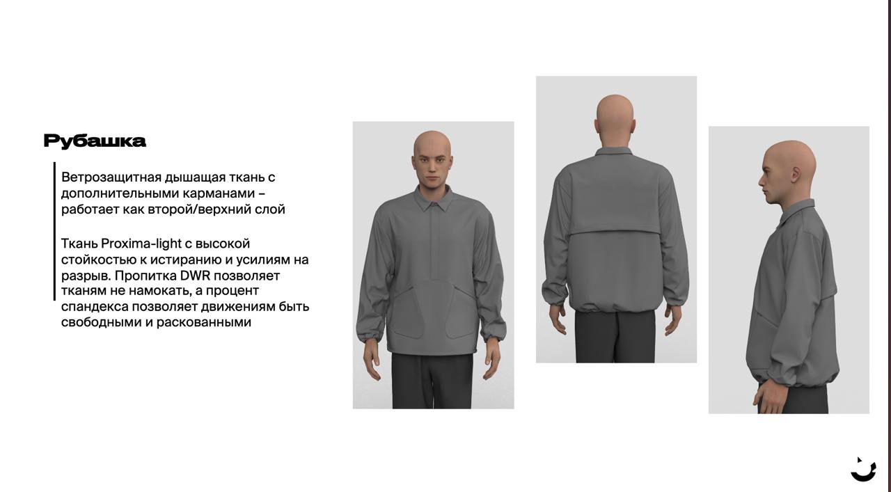 Куртка Shell — оболочка, защищающая исследователя от дождя. В сердце изделия лежит идея лёгкости, компактности и функциональности материалов. Куртка, как незримая оболочка, защищает от внешних факторов.